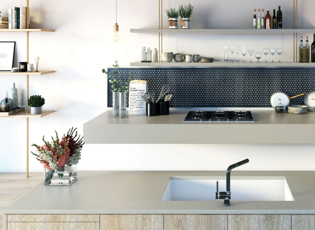 Đá giả xi măng mang đến vẻ sạch sẽ và tiện nghi mà khó dòng đá nào mang lại, rất phù hợp với màu sắc của toàn bộ căn phòng. Màu sắc khá lạnh thích hợp với các thiết kế hiện đại, tinh tế. Gia chủ nếu đã sở hữu không gian bếp màu trung tính chủ đạo thì việc ốp lát gam màu xi măng trên bề mặt bếp sẽ làm cho không gian trở nên hài hòa và có chiều sâu hơn. Bàn bếp nấu hay bàn ăn, bệ chậu rửa cũng không làm khó được sản phẩm này.