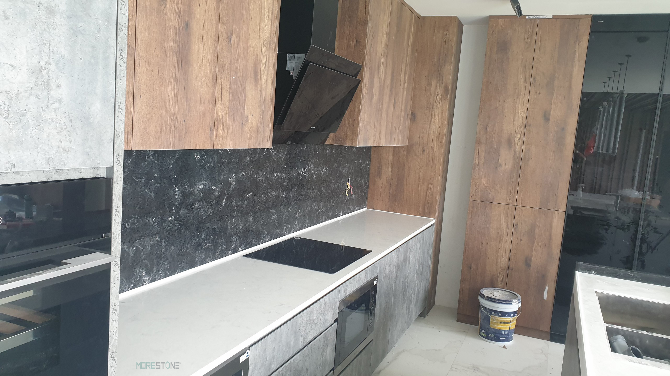 đá ốp bếp màu đen , ecopark , ốp bếp màu tương phản , thi công căn hộ ecopark
