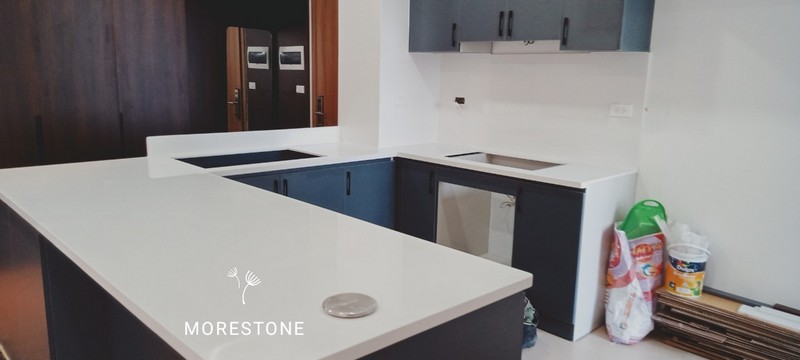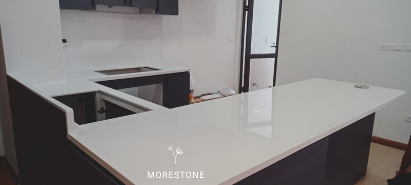Khách hàng lựa chọn mẫu đá bếp chất liệu solid surface nhập khẩu LG Hàn quốc - dòng đá cao cấp có ưu điểm chống ngấm ố, dễ dàng vệ sinh, thi công liền mạch không mối nối