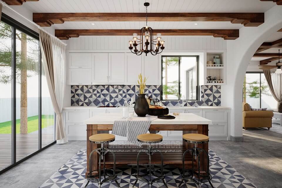 Ngoài điểm đặc biệt từ cách bố trí kệ trang trí, bàn đảo bằng đá granite màu trắng được thiết kế nhô ra ngoài lại là điểm đáng chú ý, một mặt vẫn đảm bảo diện tích để chủ nhân có thể trưng bày món ăn thỏa mái, một mặt bạn lại có thể vừa nội trợ vừa có thể để mắt con học một cách dễ dàng.