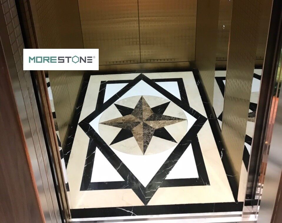 Thang máy là nơi nhiều gia chủ lựa chọn đá để lát sàn, với 1 khối đá được Morestone mài dũa, cắt ghép tạo nên nhiều chi tiết kết hợp hoàn hảo, đẹp nổi bật.