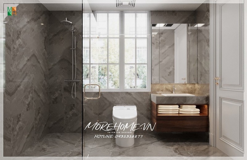 Phòng tắm được ốp lát đá nhân tạo cao cấp, sang trọng