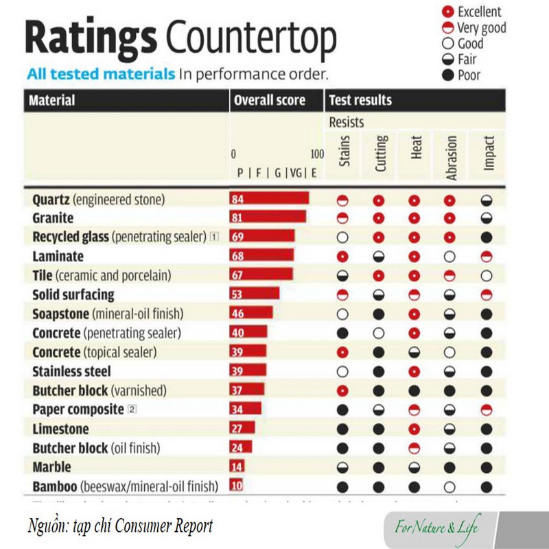 Đá granit và thạch anh được biết đến với độ bền đặc biệt và khả năng chống trầy xước, nhiệt và vết bẩn.
