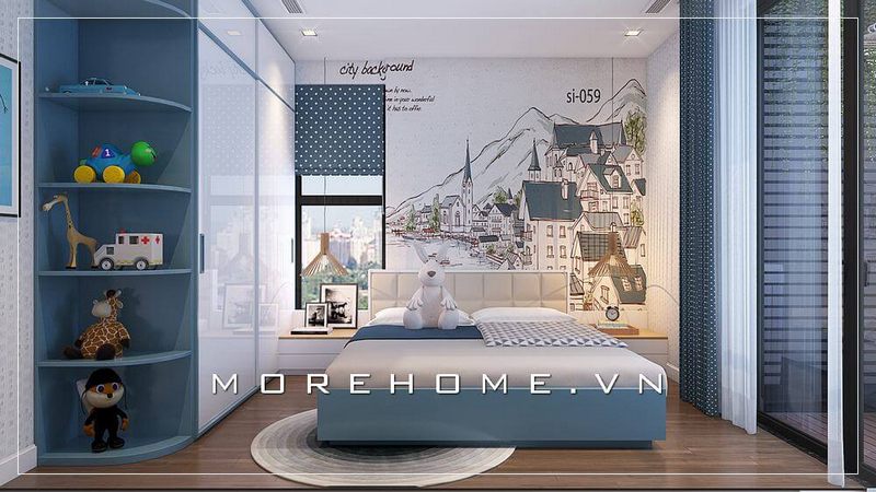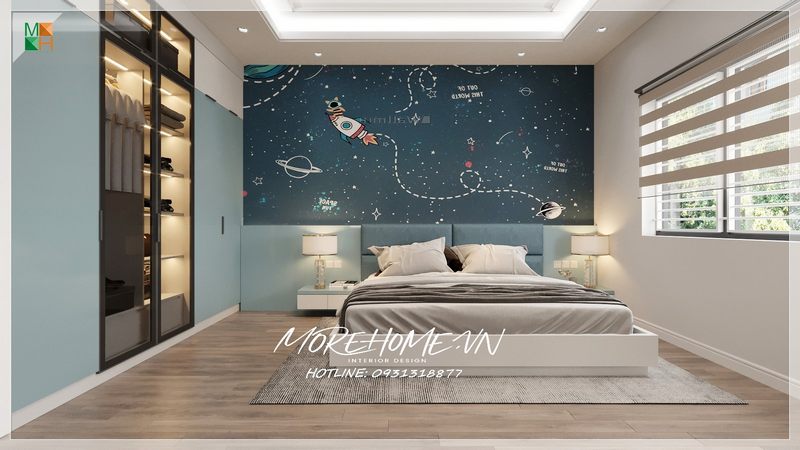 Morehome đề xuất một số mẫu thiết kế phòng ngủ kết hợp tranh dán tường có màu xanh tối, giúp tối ưu diện tích và tạo nên không gian mở rộng rãi và hiện đại.
