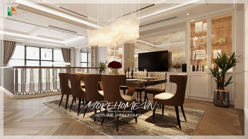 Diện tích của phòng ăn của căn hộ không lớn nhưng được thu hút bởi bàn ăn mặt đá phản chiếu ánh sáng từ hệ thống đèn chiếu sáng từ trần.