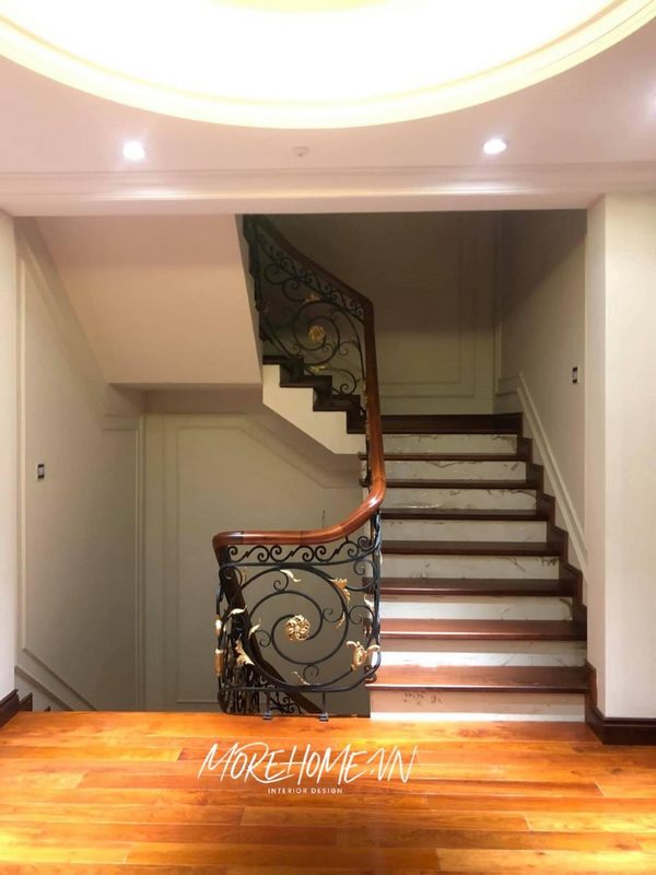 Sản phẩm cầu thang bằng gỗ tự nhiên được kết hợp với khung sắt uốn nghệ thuật, sơn đen điểm chi tiết mạ vàng, tay vịn gỗ, cổ bậc ốp đá sẽ mang lại sự sang trọng cho nhà phố, chung cư.