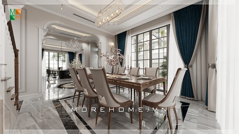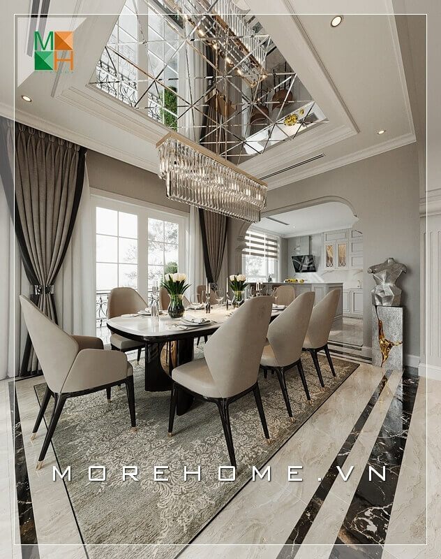 Nội thất phòng ăn của biệt thự, nhà phố sang trọng được thiết kế cao cấp với bộ bàn ghế 8 chỗ ngồi tiện nghi làm nền tảng cho toàn bộ căn phòng.