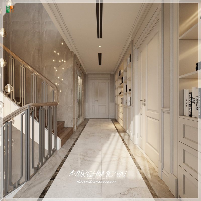 Không gian hành lang biệt thự nhà phố được tạo nên với sự kết hợp tinh tế và hiện đại của sàn đá vân mây, góp phần tạo nên một cảm giác thoáng đãng.