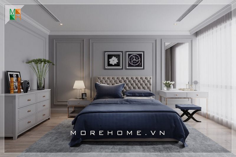 Một phòng ngủ trong căn hộ chung cư, nhà phố có phong cách tân cổ điển không thể bỏ qua sự lựa chọn một chiếc giường bọc sofa đầu giường tinh tế. Nó được đặt giữa căn phòng, với gam màu tím than của bộ chăn, ga, gối góp phần tăng thêm sự sang trọng cho không gian ngủ.