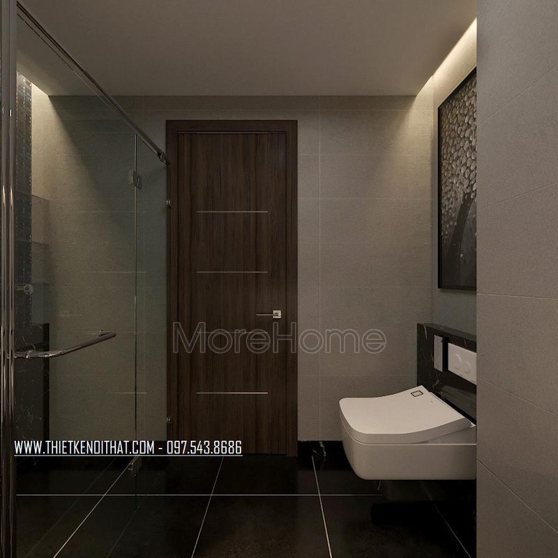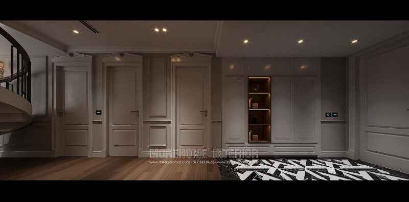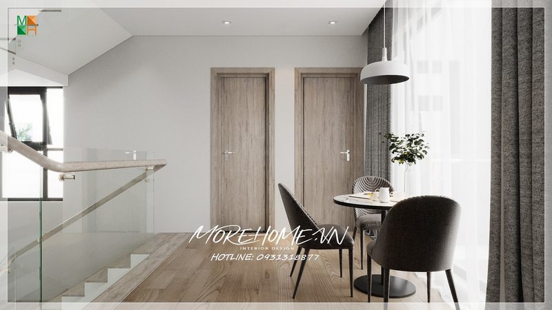 Khi bước chân vào căn phòng, cầu thang kính tay vịn gỗ đẹp sang trọng sẽ làm nên ấn tượng và bắt mắt.
