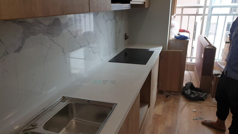 Đá ốp mặt bếp đá nhân tạo màu trắng với khả năng chống nước cao độ bền sử dụng cao tiện lợi cho gia chủ khi sử dụng và tạo cho không gian vẻ đẹp cao cấp.