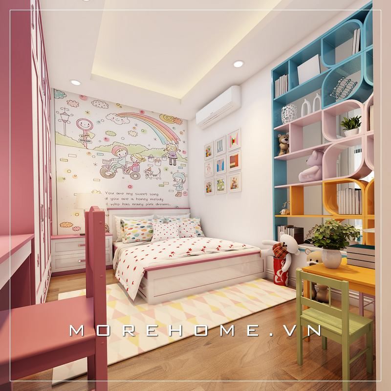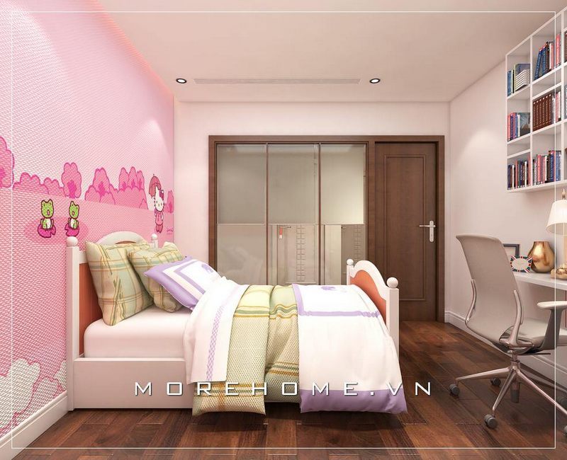 Giường ngủ hiện đại màu trắng tinh tế, kết hợp với các họa tiết màu hồng sẽ tạo nên một không gian độc đáo và lôi cuốn cho phòng ngủ của bé gái.